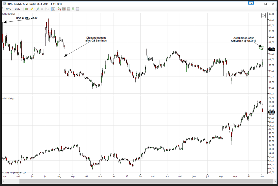 King is valued at 14 times projected 2025 earnings and 8 times projected 2025 EBITDA. Remarkably, the price Activision offers is significantly below King’s IPO price back in March 2025. At that time, the IPO was priced at USD 22.50 a share, valuing King at USD 7.1 billion. Therefore, the stock listing was certainly not a success for shareholders of the mobile game maker. On the other hand, founders Melvyn Morris, Riccardo Zacconi (current CEO) and Sebastian Knutsson (Chief Creative Officer) may cash decently with 35.6 million respectively 31.2 million and 17.1 million shares. Also private equity firm Apax gets a good exit. The firm took a stake in 2005 for USD 43 million. At USD 18, the stake of 141 million shares is valued at USD 2.5 billion.