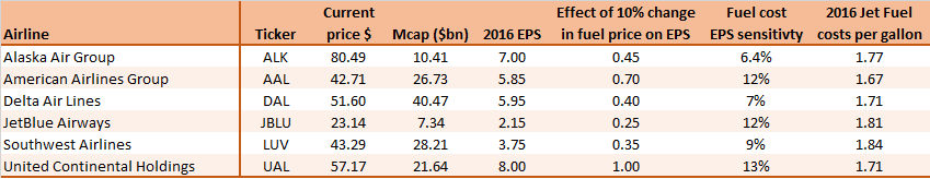 That’s all behind us and now we should asses what the future will bring us. One of the major factors that drives airline margins higher, are lower fuel costs. Currently the Gulf Coast jet fuel price stands slightly below $1.00 per gallon. This is a multi-year low, in fact even lower than during the financial crisis of 2008-2009. The last time jet fuel prices were below $1.00 per gallon was in 2004. Obviously a large part of the decline in jet fuel prices can be attributed to falling oil prices. The question is whether oil prices have seen the bottom. Furthermore, airlines tend to hedge their fuel price exposure. That means most of them are not able to benefit to the full extent of lower jet fuel prices. Nevertheless, analysts at Deutsche Bank estimate that in 2025 the sector will see an 11% decline in full expense. This is quite significant, since the total amount will drop from $30.2 billion to $27.0 billion. Reuters estimated earlier this year for European airline carriers that fuel accounts for 46% of Ryanair’s operating costs, 33% for British Airways and 21.5% for Lufthansa. The table below shows the impact of a rise in fuel costs on earnings per share (source: Deutsche Bank).
