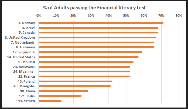 It wouldn’t surprise you that poor countries show low ratings of financial literacy. But that only 57% of people in the richest country on earth pass a relative simple test may cause some raised eyebrows. The United States ranks at the 14th place of the Financially Literate with a score only 3% higher than Bhutan, which ranks 130th in the list of GDP per capita. Fortunately, the US is at par with bankers country Switzerland. The most financial literate, which means how well one understands the way money works in the world, live in Scandinavia. Norway, Denmark and Sweden show a score of 71%. Yemen is at the bottom with only 13% passing the test.