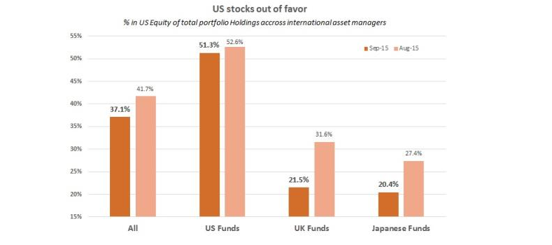 Fund managers across the globe were unanimous in a bearish view on US stocks and reduced their positions drastically (see chart below). This was also illustrated by EPFR Global data which showed that during the record week for money market funds, investors took USD 7.4 billion out of the SPDR S&P 500 ETF.